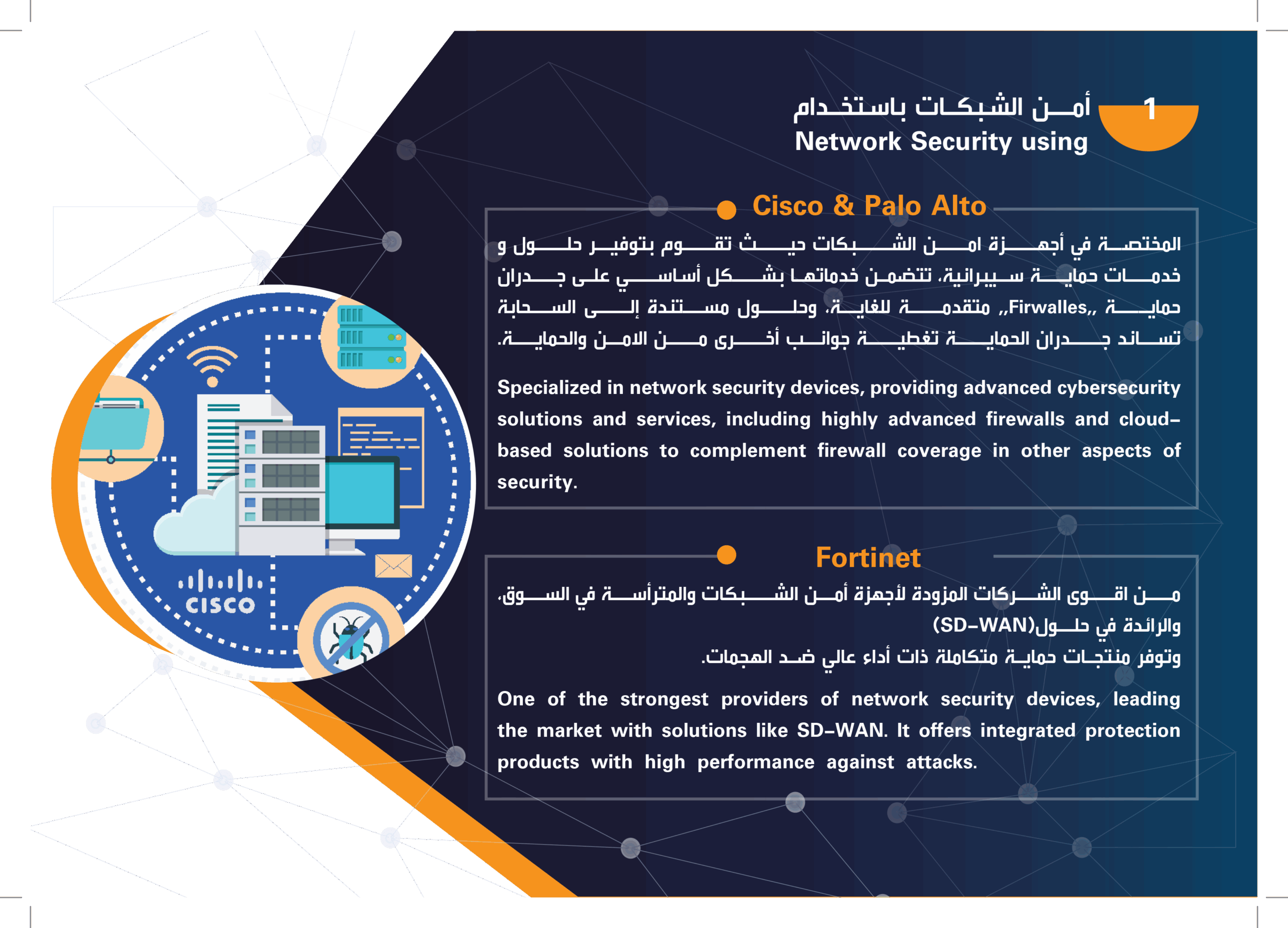 المختصة في أجهــزة امــن الشــبكات حيــث تقــوم بتوفير حلــول و خدمــات حمايــة سيبرانية، تتضمن خدماتها بشــكل أساســي على جــدران حمايــة” Firewalls” متقدمــة للغاية، وحلــول مستندة إلــى السحابة تساند جــدران الحمايــة تغطيــة جوانب أخــرى مــن الامن والحمايـة.